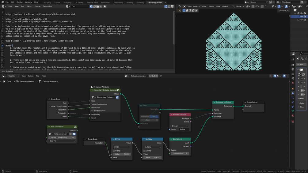 This is an implementation of an elementary cellular automation using Blender 4.1 geometry nodes. The presence of a cell on any row is determined by a rule applied to the value of its immediate parent and its siblings. The default configuration is a single active cell in the middle of the first row. A random distribution can also be set on the first row. Various rules can be selected by a drop-down menu. The output is a diagram containing ico-spheres representing the active nodes as specified by the given rule.
